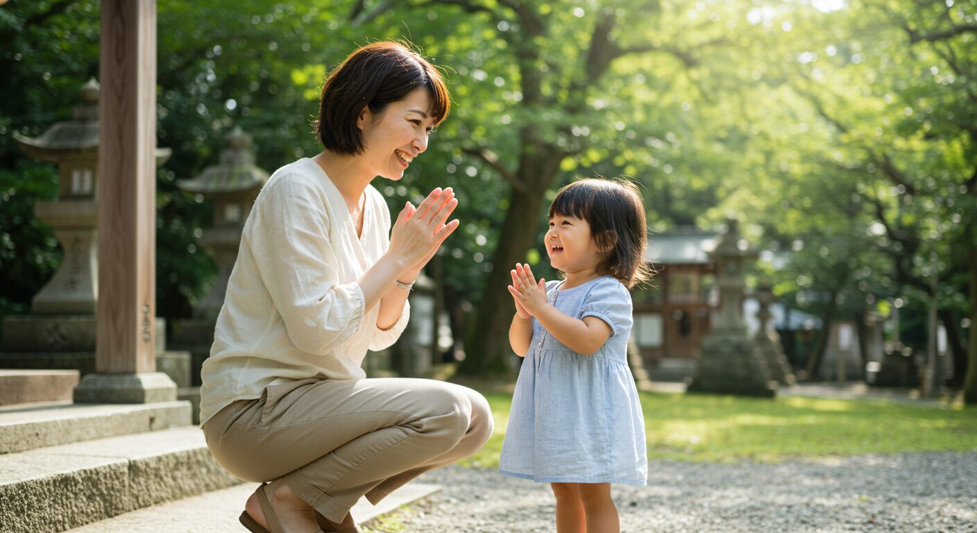 神社の境内で、子供と一緒に笑顔で手を合わせる母親